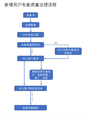針對于對企業(yè)新建項目的用電接入造成配電系統(tǒng)的影響,電力公司進一步提出電能質(zhì)量的相關(guān)要求要求,根據(jù)電網(wǎng)相關(guān)規(guī)定,非線性用戶接入電網(wǎng)(業(yè)務(wù)擴報裝階段)需用戶委托有資質(zhì)的單位開展接入系統(tǒng)設(shè)計及電能質(zhì)量預(yù)測評估分析。